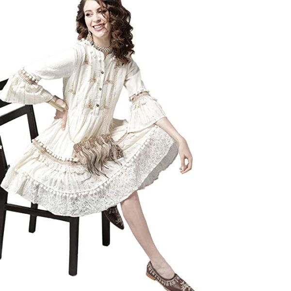 Cotton Off White Lurex Embroidered A-Line Dress, Has Mandarin Collar & Bell Sleeves, Which Is Comfortable To Wear For All Seasons.